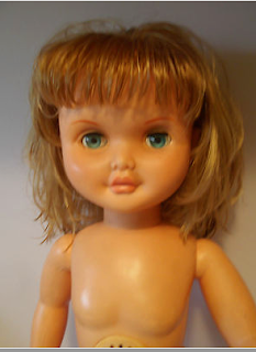 Es una muñeca grande, bastante más que Nancy, con iris margarita. Lleva un llorón en la tripa pero está completamente arruinado, solo está bien el cajetín que se incrusta en el cuerpo, dentro solo había una cosa verde con aspecto de arcilla seca que no tengo ni idea de qué función hace ni que aspecto tenía originalmente. El vestido se ve que es caserito y no le va mal con ese color de ojos aunque la idea es hacerle uno yo misma cuando acabe los 1.500 proyectos que tengo pendientes.
