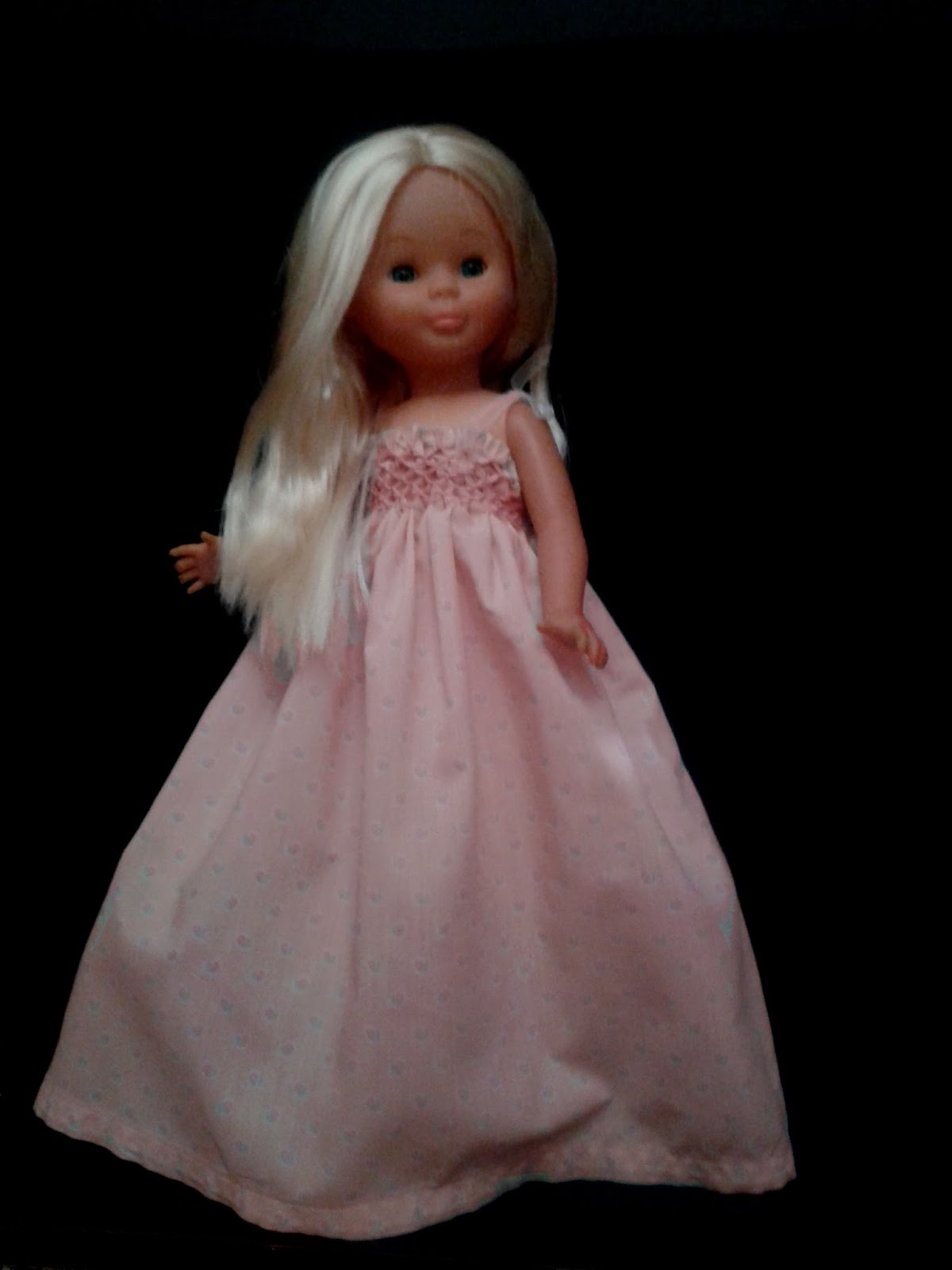 12 años hemos tardado en hacer este vestido. ¿Quién lo iba a decir? Lo empezó mi hermana Patricia. Hizo todo el entramado de nido de abeja para el canesú de mi sobrina Diana que entonces era un bebé. Nunca se lo terminó porque le faltó tiempo o paciencia o se aburrió o vete a saber qué. El caso es que ahora que se ha montado su nueva casa y ha abierto cajas y más cajas han ido apareciendo estas cositas del pasado. Me regaló el retal por si lo podía aprovechar para muñequitos y ... me parecía una pena no dar uso a lo que ya estaba hecho y con tanto cariño así que puse el canesú sobre Nancy y ... justo tenía la medida de su contorno. El resto fue coser y cantar, dar un largo muy largo y un buen planchado. Lo único que fue muy entretenido fue el dobladillo de arriba, muy escasita que andaba de tela para meter y con los pliegues dificultando sujetar bien la labor pero el caso es el resultado, que a mí me gusta mucho. Algo con un aire naif y romántico que le va muy bien concretamente a esta Nancy. Y aún me ha sobrado para hacer un par de conjuntos con faldón a 2 Nenucos idénticos que hace tiempo quiero regalar a mis sobrinas gemelas, si salen bien os los enseñaré más adelante.